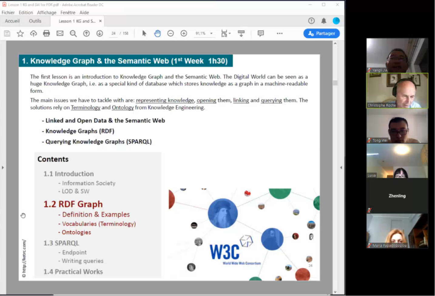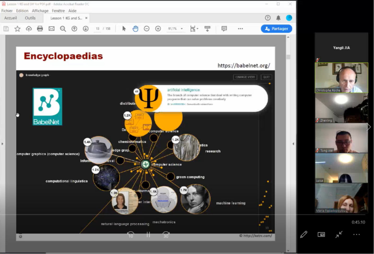 为落实学校党委关于做好疫情防控期间“停课不停教、停课不停学、停课不停研”的部署,4月23日至6月11日,龙8-long8(中国)唯一官方网站利用Zoom会议系统开展了6场线上学术报告和国际交流活动。 线上系列学术报告与交流围绕“数字人文时代的本体与术语学”展开,包括了“Knowledge Graph & the Semantic Web”、“Terminology”、“Ontology”、“Digital Humanities”、“Smart City”五个专题,由我校外知识工程与术语学中法联合研究中心主任Christophe Roche教授主讲。希腊学者Maria Papadoupulou教授、中国人民大学安小米教授、山东省标准化研究院高永超研究员、维也纳大学刘翚博士,以及多位ISO TC37委员会国际标准制定专家、 IEC智慧城市国际标准制定专家、我校知识工程与术语学中法联合研究中心成员、龙8-long8(中国)唯一官方网站部分教师与研究生等30余人参与了这一系列交流活动。 通过此次线上学术交流活动,与会专家对知识图谱、语义Web、计算术语学、数字人文和智慧城市标准等内容进行了深入交流,达成了下一步合作意向。同时,本系列活动的成功开展也拓宽了学术研究讨论的渠道,丰富了学术活动与国际交流的形式,开阔了师生学术视野。
