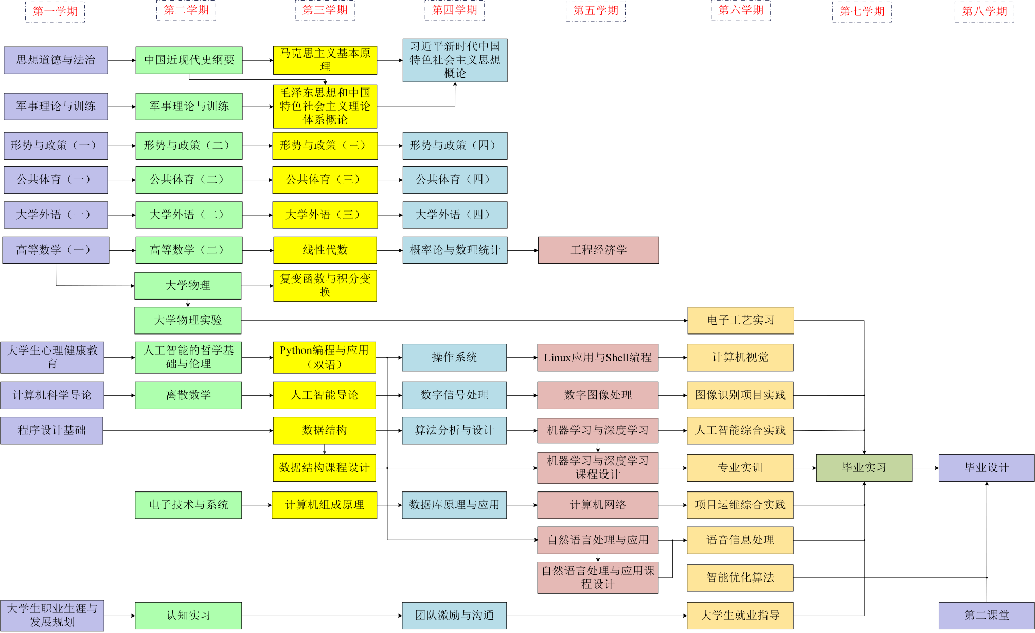 主要课程:高等数学、线性代数、概率论与数理统计、计算机科学导论、复变函数与积分变换、人工智能导论、程序设计基础、大学物理、电子技术与系统、离散数学、数据结构、计算机网络、人工智能的哲学基础与伦理、数据库原理与应用、Python编程与应用、数字信号处理、数字图像处理、机器学习与深度学习、自然语言处理与应用、团队激励与沟通、工程经济学、计算机视觉、人工智能综合实践、项目运维综合实践等。