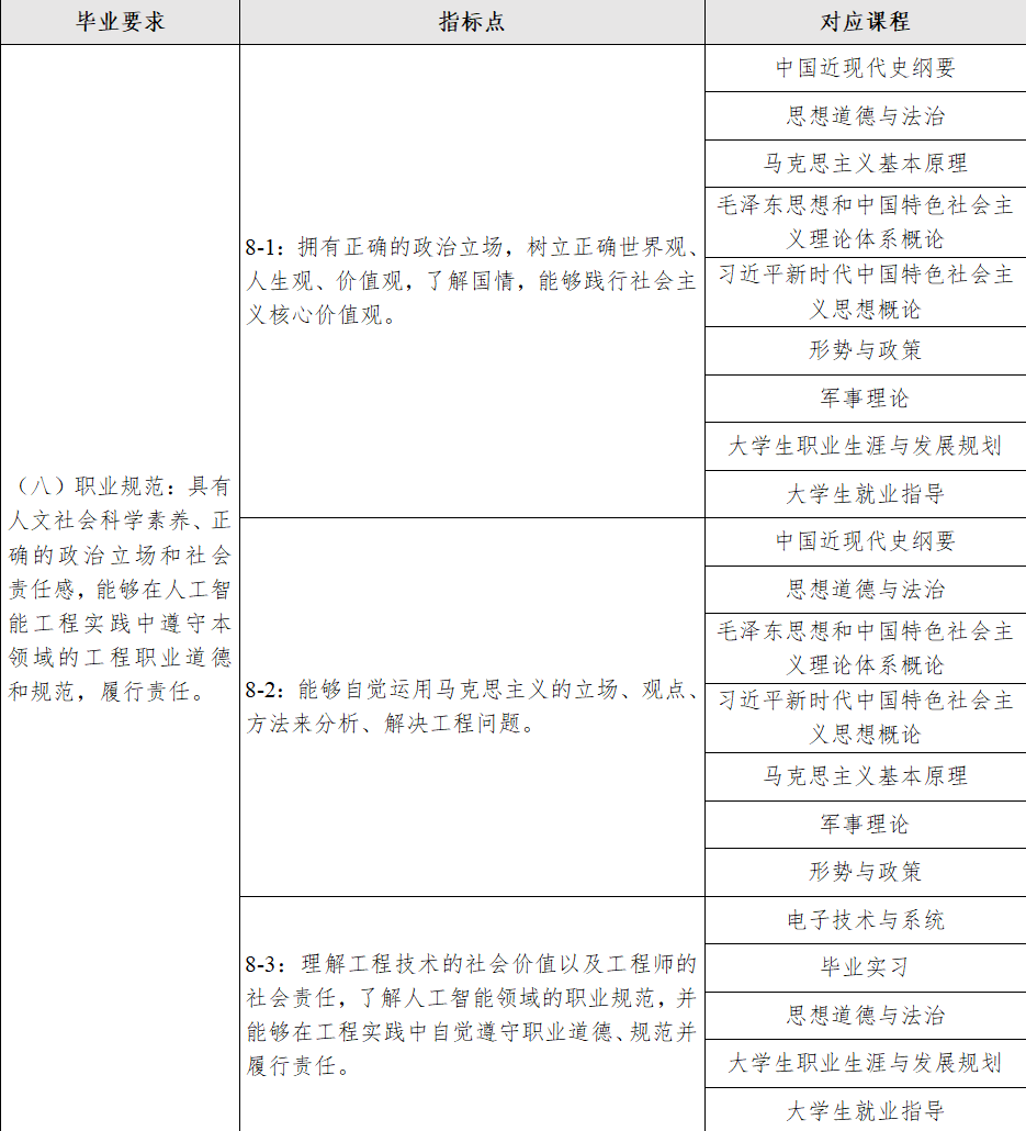8.职业规范:具有人文社会科学素养、正确的政治立场和社会责任感,能够在人工智能工程实践中遵守本领域的工程职业道德和规范,履行责任。