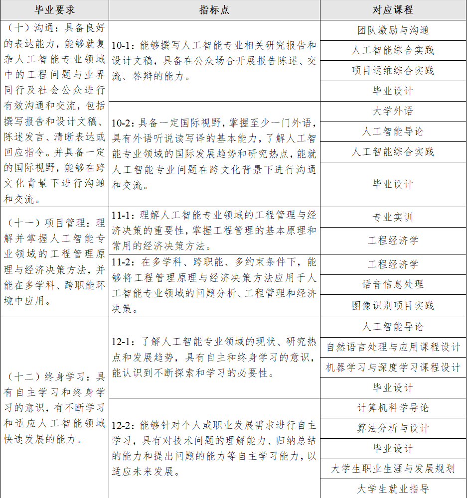 10.沟通:具备良好的表达能力,能够就复杂人工智能专业领域中的工程问题与业界同行及社会公众进行有效沟通和交流,包括撰写报告和设计文稿、陈述发言、清晰表达或回应指令。并具备一定的国际视野,能够在跨文化背景下进行沟通和交流。
