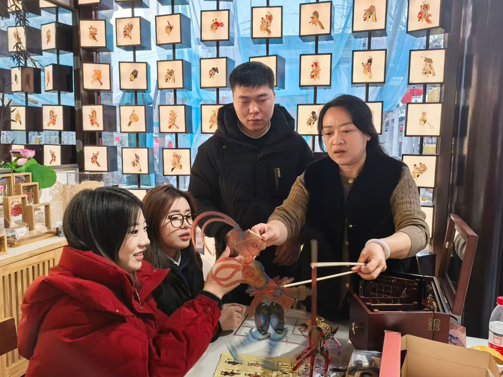 创新传承,影绘新生。团队成员前往济南皮影青年之家,聆听济南皮影戏传承人深入浅出地讲解济南皮影戏的历史渊源、艺术特色等相关知识,观看《武松打虎》《孙悟空大战蝎子精》等经典剧目表演。在观影过程中,与传统印象中的皮影戏不同,团队成员能明显感受到济南皮影戏的独特之处,它巧妙融入现代化元素和笑料,经典故事结合当下热点,以幽默诙谐的语言被讲述,让人忍俊不禁,唱腔里也偶有现代音乐的韵律,使古老艺术得到焕新。这种现代化的创新让古老的皮影戏带来别样的观赏体验,既保留传统韵味,又符合当代各年龄段观众的喜好。在讲解期间,团队成员从游戏《黑神话︰悟空》中提出应如何看待科技带领非遗传承的问题,传承人表示,在当今科技创新的时代浪潮下,皮影戏艺术确实需要与时俱进,但前提是牢牢坚守其文化根本,只有在稳固根基的基础上合理创新,才能既让皮影戏贴合现代观众的审美需求,又不失其独特的艺术价值与文化内涵,实现传统文化的可持续传承与发展。在讲解与表演结束后,传承人现场传授皮影操纵技巧。团队成员认真聆听、仔细观察,纷纷亲自上台尝试,演绎一段段精彩小故事。在实践过程中,大家切实感受到济南皮影操纵的乐趣与挑战,也对济南皮影戏这一古老非遗艺术有了更为深刻地感悟与认知。