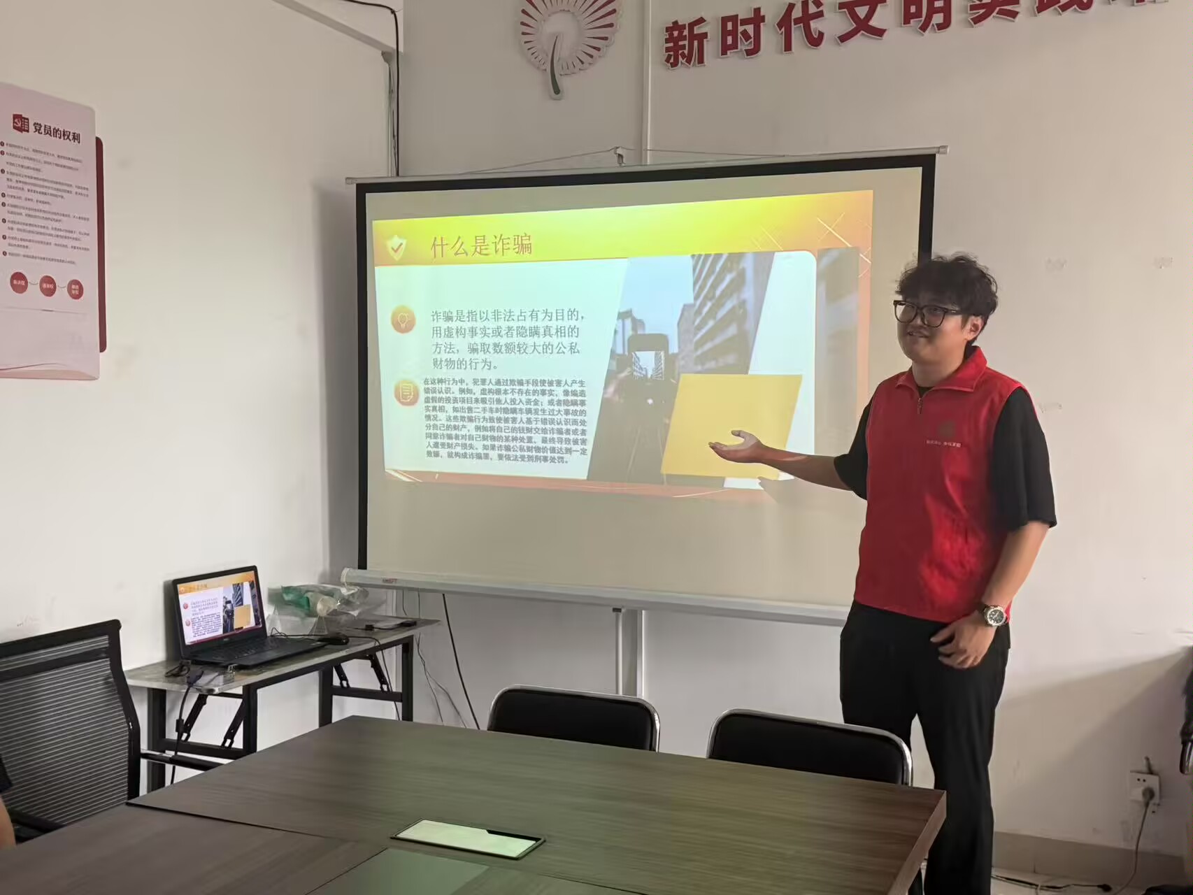 活动伊始,同学们通过图文并茂的PPT和视频演示,并结合近期高发的“刷单返利”“冒充公检法”“ai换脸”等现实案例向社区居民们揭露诈骗套路,让社区居民意识到安全问题就在身边,提醒居民“不轻信、不透露、不转账”,将反诈意识培养渗透到生活的方方面面。接着从学习反诈知识,养成安全习惯,善用技术工具,建立心理防线四个角度提出提高居民反诈能力的方法论,培养社区居民面对各类信息的警觉性与识别诈骗套路的能力,将保护个人信息牢记心中,帮助社区构建反诈教育平台,有效进行反诈宣传工作。互动环节中,同学们为居民耐心解答反诈问题,将反诈要点编为口诀,组织提问接龙,并帮助社区老人下载国家反诈中心APP,以技术手段筑牢安全防线。