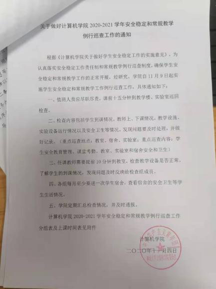 优良的学风是激励学生奋发向上、努力成才的强大的精神力量,是学校全面贯彻落实党的教育方针,提高育人质量的重要保证。学院领导把学风建设作为提高龙8-long8(中国)唯一官方网站教学质量和办学水平、确保学生培养质量的一项重要工作来抓。为认真落实安全稳定工作责任制和常规教学例行巡查制度,确保学生安全稳定和常规教学工作的正常开展,在学院领导的高度重视和支持下,龙8-long8(中国)唯一官方网站于2020年11月4日修订《龙8-long8(中国)唯一官方网站关于做好学生安全稳定工作的实施意见》,由学院领导带队组成巡查小组,每天进行学生安全稳定和常规教学工作例行巡查工作。