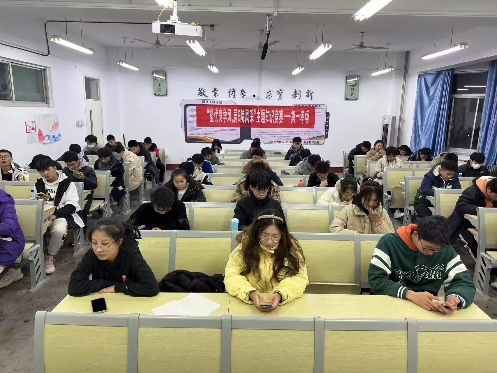 本次学风建设知识竞赛采用线上作答的方式,竞赛内容集知识性、教育性于一体,坚持理论指导实际,旨在以学风建设助推综合素质教育。活动伊始,易班工作站工作人员就竞赛方式、竞赛时长、竞赛内容等方面进行讲解,使同学们初步了解本次知识竞赛活动流程。随后,工作人员按照竞赛相关规定,组织同学们间隔落座,同时做好答题截图回收和相关数据统计。竞赛过程中,工作人员进行考场巡查,确保竞赛遵循公平、公正、公开的原则,为龙8-long8(中国)唯一官方网站落实“应考尽考”和“诚信考试”提供保障。竞赛结束后,同学们纷纷表示今后要端正学习态度,规范自身行为,在学院内营造健康向上的学习氛围,弘扬勤奋踏实、拼搏进取的昂扬精神。