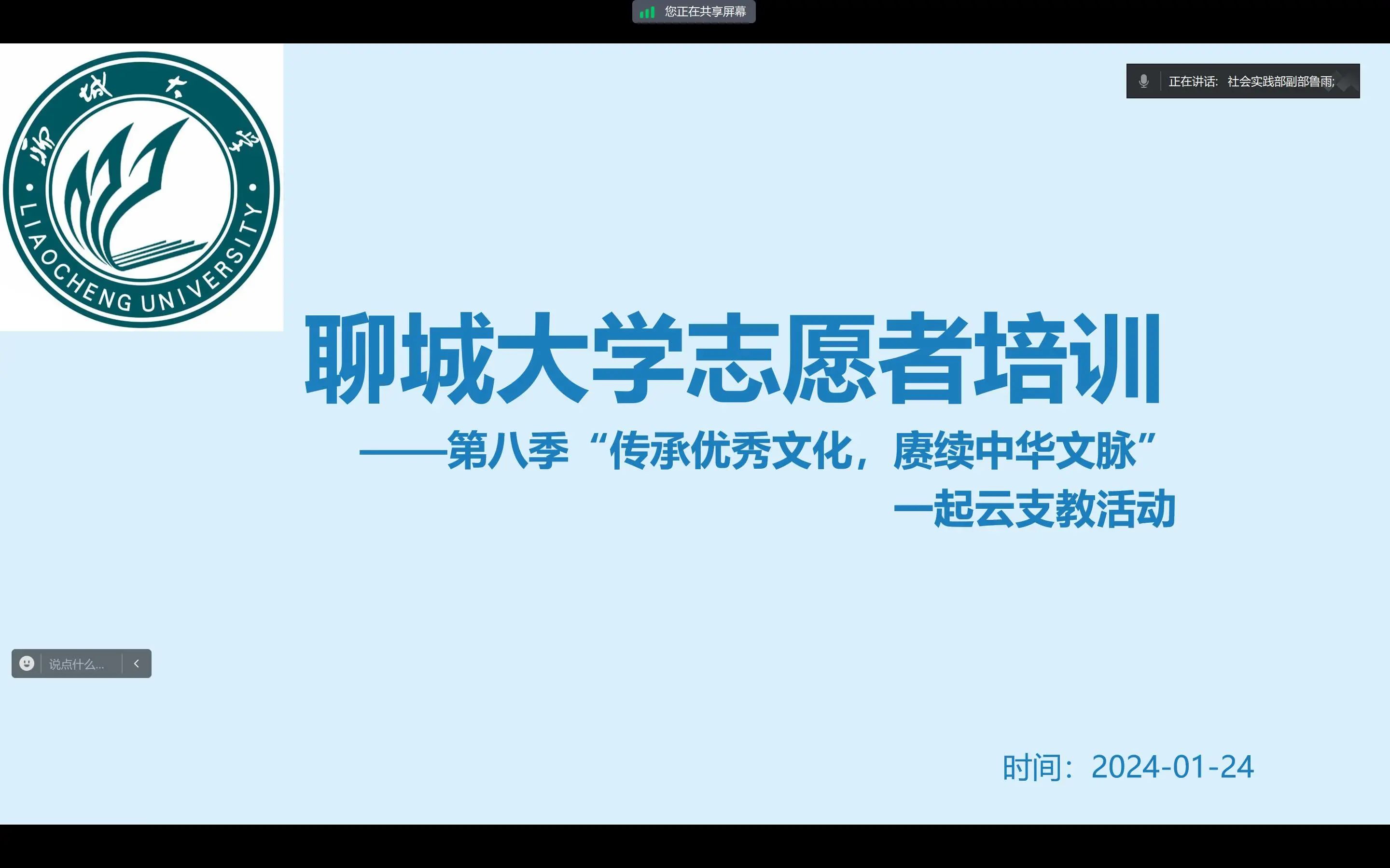 为了让志愿者们更快地熟悉活动内容和流程,鲁雨对全国大学生2024寒假“返家乡”社会实践“一起云支教”专项活动进行详细说明,主要分为活动简介和要求两方面。她通过活动的不同板块详细地介绍了志愿者的任务与职责,以及活动的实施方案与内容,并对同学们提出的相关问题答疑解惑。随后,主讲人说明了活动的要求,除对志愿者做出了基本要求以外,对学生个人信息的保密方面也做了强调,让志愿者们对活动内容和要求有了更深入的理解和认识。最后,鲁雨介绍了不同活动板块的志愿者时长占比情况,并呼吁同学们要以饱满的热情和专业的态度投入到志愿服务中,尽己所能的为社会献出一份力量。