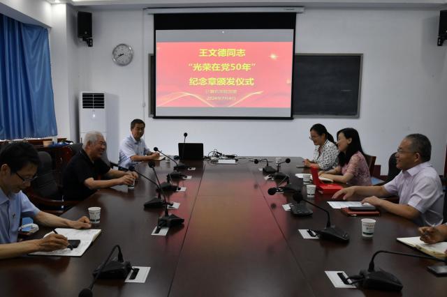 首先,贾仰理代表学院党委向王文德同志表示热烈祝贺,对王老师为学院事业的发展所做的贡献致以崇高的敬意。随后,学院党委书记贾仰理、院长桑红燕共同为王文德同志颁发纪念章。接下来,桑红燕向王文德同志汇报学院发展近况,再次感谢王老师为学院的发展做出的贡献,并希望老党员同志能够一如既往的支持、关心、帮助学院的发展。最后由王文德同志讲述自己的入党故事和在党、在岗的经历。与会同志纷纷表示要以老一辈党员为榜样,继承和发扬老党员的优秀品质、崇高精神和优良作风,在推动学院高质量发展中埋头苦干,努力创造属于这一代人的功绩。
