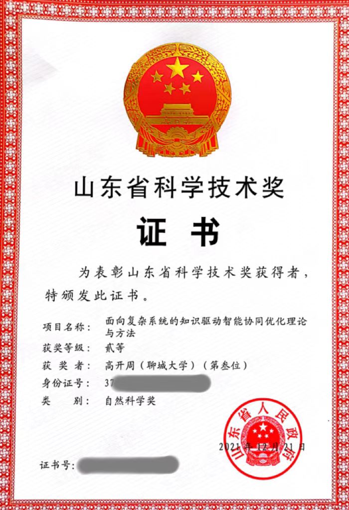 近日,山东省人民政府公布了《关于2021年度山东省科学技术奖励的决定》。龙8-long8(中国)唯一官方网站智能优化算法及其应用团队成员高开周老师参与的“面向复杂系统的知识驱动智能协同优化理论与方法”项目成果获得山东省自然科学奖二等奖。