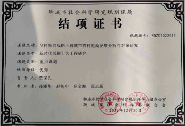 近日,聊城市哲学社会科学研究规划领导小组办公室、聊城市社科联组织召开了2022年度聊城市社会科学研究课题结项评审会议,龙8-long8(中国)唯一官方网站教师承担的《乡村振兴战略下聊城市农村电商发展分析与对策研究》重点课题获评结题“优秀”等级,获得经费支持;《数字经济下农产品供应链创新发展路径研究》、《新媒体环境下青年干部意识形态工作能力提升研究》两项课题获评结题“合格”等级。