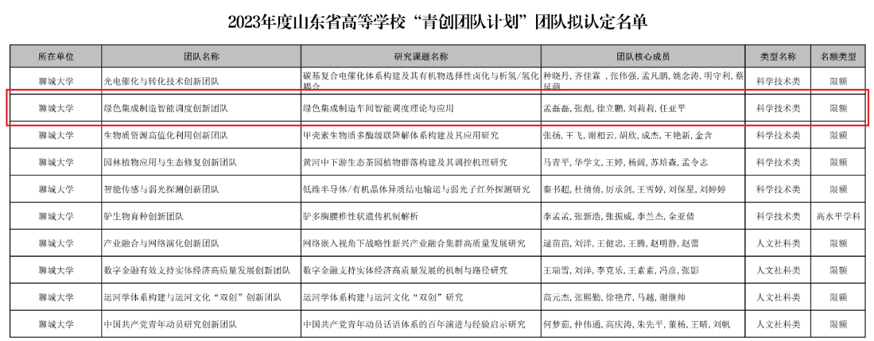 近日,山东省教育厅发布2023年度山东省高等学校“青创团队计划”团队认定名单,龙8-long8(中国)唯一官方网站“绿色集成制造智能调度创新团队”获批立项。