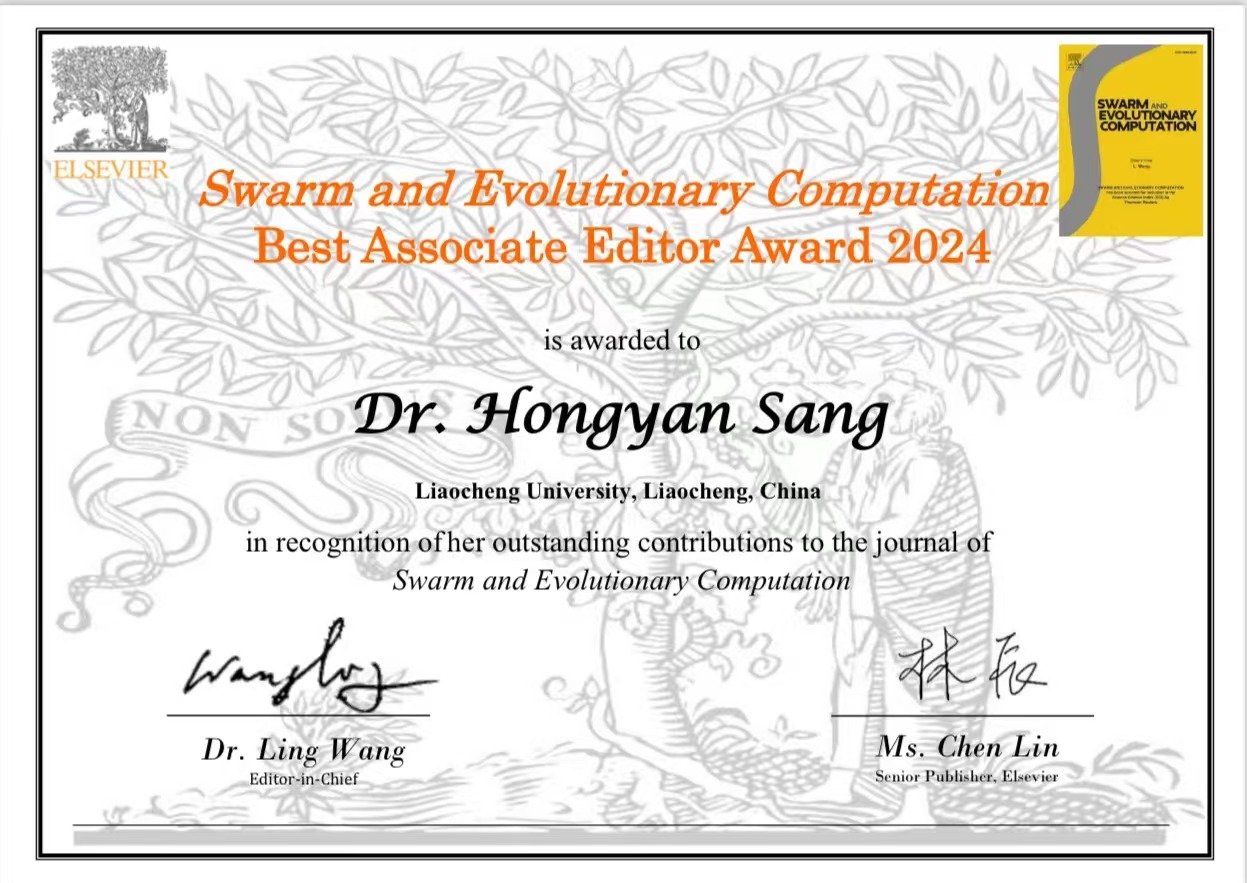 近日,龙8-long8(中国)唯一官方网站桑红燕教授获中科院一区期刊《群体与进化计算》(《Swarm and Evolutionary Computation》,SWEVO)2024年度最佳副主编奖(Best Associate Editor Award) ,以表彰其对期刊发展做出的杰出学术与服务贡献。 据悉,爱思唯尔(Elsevier)出版社根据稿件处理数量、质量、效率等进行综合评价,从SWEVO期刊66名副主编中遴选5位授奖,这是该期刊首次评选此奖项。荣获此奖,不仅表明桑红燕教授在群体智能领域具有重要影响力,也有助于提升聊城大学在相关领域的影响力。 《群体与进化计算》(《Swarm and Evolutionary Computation》)是爱思唯尔(Elsevier)旗下期刊,是群体智能与进化计算领域的权威期刊,收录面向复杂系统的智能优化理论、方法及应用方向的相关研究成果。该期刊的最新SCI影响因子为8.2,中科院一区期刊,JCR分区Q1。